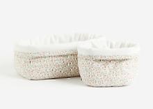 Paniers de rangement matelassés en toile de coton de tailles variées. Modèle avec bord rabattable. Hauteur 12 cm. Largeur 14 cm. Longueur : petit panier 14 cm, grand panier 28 cm.
