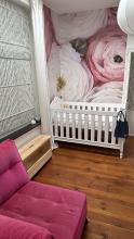 Transformation par nos soins de ce qui était initialement un bar en belle chambre d'enfant : peinture, papier peints, parquet, placards, lustres, châssis et fenêtre, portes, rideaux, etc.