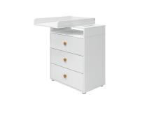 Roomie commode met drie lades en ronde houten knoppen in verschillende kleuren. Hij heeft gladde randen en soft-close zodat er geen vingers vast komen te zitten bij het openen en sluiten van de lades. De commode biedt een overvloed aan opbergoplossingen. De bovenkant van de commode kan worden gedraaid om ruimte in de k