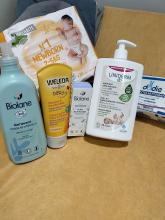 Premier kit hygiène pour la maternité. Nous avons pris en test, un gel douche, du liniment, des lingettes, de l'huile de massage ( pour les massages de papa), des lingettes pour les déplacements, etc. Produits achetés chez Auchan, Medimarket etc