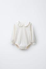 Body avec col Claudine et manches longues finies par élastique. Fermeture goutte d'eau avec bouton dans le dos et à pression sur le bas.