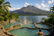 Imagine-toi plongé(e) dans des bassins d’eau turquoise, entouré(e) de jungle et de montagnes, avec une vue spectaculaire sur le lac Batur et le volcan encore actif.