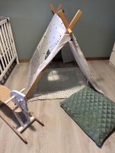 Trousse comprenant 10 accessoires essentiels pour les soins de bébé. Fabriquée avec du polyester recyclé, facile à transporter, avec de nombreuses poches et élastiques pour ranger les affaires de bébé.