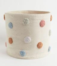 Panier de rangement rond. Modèle avec intérieur tressé et extérieur en coton tissé à pois tuftés doux. Hauteur 26 cm. Diamètre 30 cm.