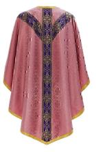 La fameuse chasuble rose qui sert deux dimanches par an, au milieu de l'Avent et du Carême. Le blanc de la fête se mêle au violet de la pénitence.