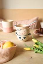 Bol personnalisé au nom de Éma, et dessin de Chat de couleur rose, peint à la main et fabriqué en France. Des animaux attachants s'invitent sur nos bols pour le plaisir des petits et des grands ! Le bol personnalisé Chat sera la star de vos petits-déjeuners avec son joli minois rose.