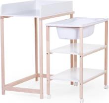 Cet ensemble de soins pratique se compose d'une table à langer en bois et d'une baignoire.