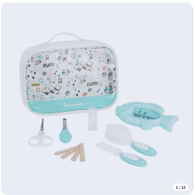 Une jolie trousse de toilettes avec plusieurs accessoires pour le quotidien : peigne, brosse à cheveux, thermomètre pour le bain, coupe-ongles, ciseaux, lime à ongles et brosse à dents.