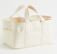 Sac à langer en toile de coton qui permet d'avoir le nécessaire à porter de main au moment du change à la maison, qu'importe l'endroit du change