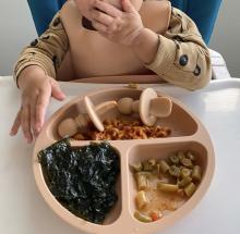 Assiette DinnerBoard spécial DME avec ventouses qui adhèrent à la table : Fini l'assiette renversée! Silicone alimentaire, non toxique et inoffensif.