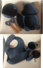 Acheté en seconde main - Ce lot comprend : 1 assiette ventouse à compartiments, 1 bol ventouse, 2 couverts, 1 bavoir, tasse avec différents couvercles.