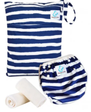 - le sac imperméable à deux poches pour y ranger le maillot de bain mouillé après la baignade, et évidemment les couches lavables et inserts.
