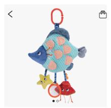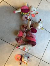1 jouet qui s'enroule autour de la poignée du maxi cosi avec parties qui pendent au dessus du bébé, et 2 jouets à tenir à la main.