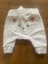 Un petit pantalon de pyjama de couleur crème, avec un dessin de tête de chat sur les fesses ^^ taille 1 mois, en coton bio.