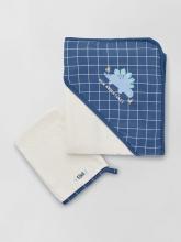Le kit essentiel pour les bains de bébé. - Cape de bain - 100% coton - En éponge - Avec capuche - Broderie fantaisie à l'avant - Imprimé 'dinosaure' à l'avant - Gant de toilette assorti