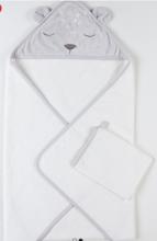 Le set de bain Kendi en matière absorbante comprend une cape de bain et un gant de toilette assorti.