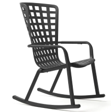 Fauteuil à bascule stylisé , relaxant et élégant, fabriqué en résine fibre de verre ajourée, avec un motif à carrés et une finition mate. Idéal pour les moments de détente.