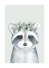 Flower Raccoon Affiche - – Illustration d’un bébé raton laveur gris portant une couronne de fleurs, sur un fond vert clair - Desenio.fr
