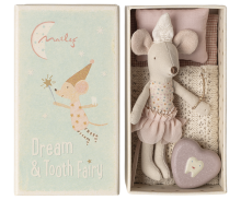 La nuit, la fée souris ramasse les dents et apporte un cadeau ou une pièce, pendant que tu fais de beaux rêves. La journée elle se repose dans le doux linge de sa boîte assortie; qui comprend aussi une boîte à dents.