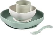 BÉABA, Set Vaisselle Silicone Repas Bébé, Avec Ventouse, Anti-dérapant, 4 Pièces, Assiette + Bol+ Verre + Cuillère, Silicone Saine et Durable, Compatible lave-vaisselle, Micro-onde, Vert Sauge :