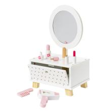 Cette coiffeuse en bois et accessoires invite votre enfant à se refaire une beauté ! Chaque accessoire à son rôle à jouer dans les histoires qu’il s’invente : le sèche-cheveux et le peigne après la douche, le rouge à lèvres, le vernis et le parfum pour la touche finale. Pratique, le grand miroir amovible permet de suivre le résultat en temps réel.