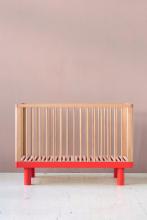 Wooden cot with a beautiful wax and lacquer finish and red details.