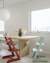 Chaise haute par le designer scandinave Peter Opsvik. Une chaise en bois de hêtre ergonomique et confortable qui grandit avec l'enfant, dès la naissan