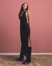 Robe midi encolure américaine brillante. Disponible en noir, marine.