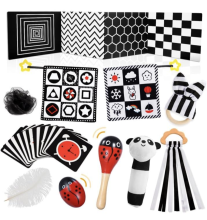 Ce jouet sensoriel comprend 1 livre en tissu recto-verso avec 12 motifs différents, 16 cartes mémoire en noir et blanc très contrastées, 1 hochet à suspendre et un tapis à froisser. Tout est conçu en fonction des caractéristiques de développement et des besoins d'apprentissage précoce des bébés à différents âges.