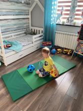 Les petits gymnastes (Alexandre et Douglas) peuvent s'entraîner à faire des roues ou des roulades autant qu'ils le veulent sur ce tapis pliable.