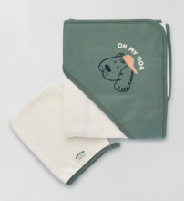 Le kit essentiel pour les bains de bébé. Cape de bain. En éponge. Avec capuche. Broderie fantaisie à l'avant. Imprimé "Oh my dog". Gant de toilette assorti