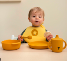 Un set de la marque Trixie lion (et ouais ils rigolent pas ma maman et mon papa) en silicone pour mon apprentissage à table. Contient 2 bavoirs, 1 assiette, 1 bol, 1 tasse et 2 cuillères