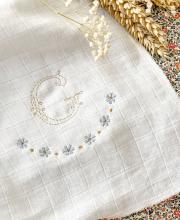 Lange en gaze de coton blanc, à personnaliser d'un prénom ou d'une initiale. Choisissez parmi nos motifs de broderie pour un cadeau poétique et personnalisé.