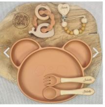 Un joli cadeau de naissance composé d'une assiette ventouse, un set de couverts, 1 anneau de dentition , et une attache-tétine.