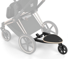 Une planche de skate board attachée à la poussette pour promener 2 enfants en même temps :)