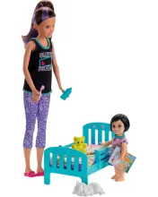 BARBIE SKIPPER BABY SITTER LIT + BEBE Aide Skipper à mettre bébé au lit. Brosse-lui les dents et raconte-lui une histoire. Bébé porte un pyjama phosphorescen...