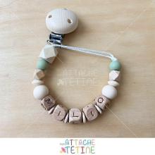 Attache tétine bébé nude vert personnalisée avec le prénom en bois. Perles en bois brut naturel et silicone vert pastel et beige clair. Hexagonales bois.