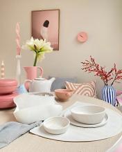 Contenu du coffret (5 articles en silicone) : bol de grande taille et bol de petite taille, assiette, bavoir et set de table.