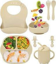 Jissta Ensemble de 8 pièces de vaisselle pour bébés en silicone, sans étui, antidérapant, sans BPA pour l’apprentissage, bol, cuillère, bavoir, fourchette, tasse pour mettre de l’eau potable pour : Amazon.com.be: Cuisine et maison