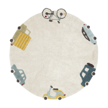 Laissez l'imagination de votre enfant prendre le volant sur ce tapis rond, doux et lavable, entouré de véhicules électriques et de vélos, avec des pompons en guise de roues. Découvre