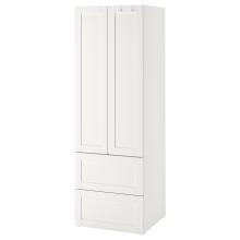 Armoire-penderie SMÅSTAD / PLATSA blanche avec tringle et tiroirs. Cette armoire ne prend pas beaucoup de place, mais elle est assez grande pour ranger de nombreuses tenues au fur et à mesure des années.