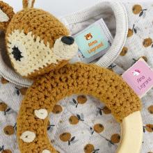 Ce hochet swing vert avec tête en tissu et anneaux en bois FSC convient aux petits à partir de 6 mois.