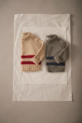 Soft, warm baby sweater with ribbed trims and cable-knit raglan sleeves. Part of Cozmo’s recycled baby clothes collection. Shop now!