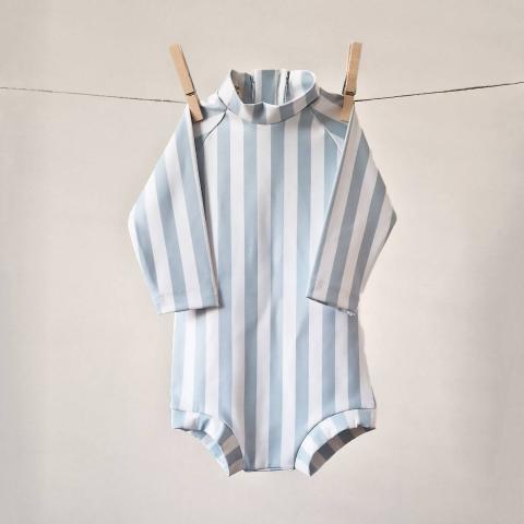 Bescherm je kleintje tegen de schadelijke stralen van de zon met onze heerlijke Swimsuit met lange mouwen. Dit zwempakje garandeert een goede bescherming voor uren plezier aan het strand of in het zwembad! Lange mouwen en een opstaand kraagje voor extra UV-bes