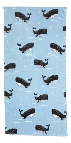 Een badlaken van katoen met velours en een geprint motief aan de voorkant en badstof aan de achterkant. Lusje aan de korte zijden.