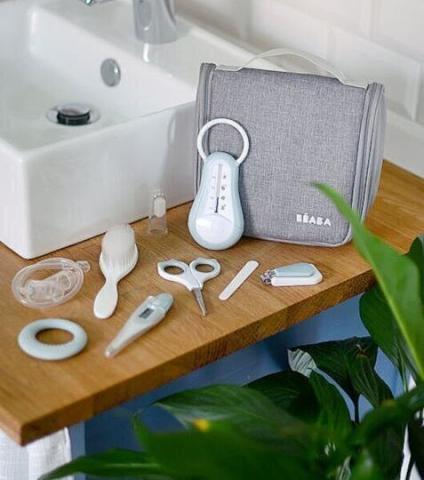 ESSENTIAL ACCESSORIES FOR WASHING AND BABY CARE. Bath thermometer, digital thermometer, scissors, nail clippers, hairbrush, teeth ring, gum massager, manual nasal aspirator, nail file.