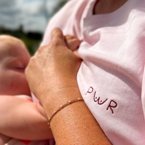 Stijlvolle borstvoedingskleding nodig? Dit roze O-hals t-shirt van Latte Mamiato combineert comfort, discretie en een zachte bloesemtint – perfect voor voedingen onderweg.