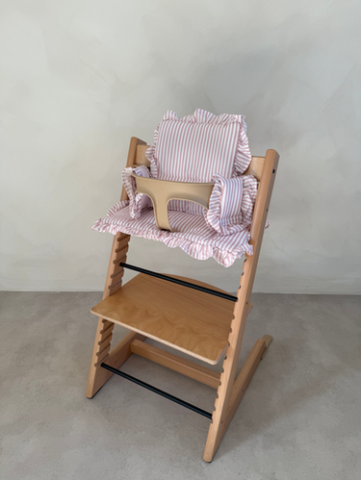 Introducing our brand new ruffle collection specially designed to fit the Stokke Tripp Trapp highchair. Give your child’s high chair a touch of comfort and style with our waterproof cushion. Designed to fit the seat and backrest of popular adjustable wooden high chairs, it makes mealtimes cosier while being practical for everyday use. Cleaning is simple: just wipe with a damp sponge.For tougher messes, the cushion can be machine washed at 30°. This versatile cushion grows with your chair, it fits perfectly with the baby seat to make those first meals more comfortable, and can be used again when your little one transitions to the bigger seat. Finer Details:- 100% polyester- Wipe clean, can be machine washed for tougher stains at 30 degrees max. This is an independent accessory, not made or endorsed by any high chair manufacturer.