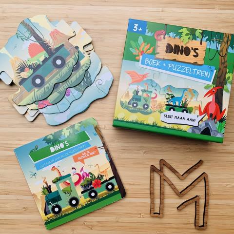Leg de stukjes van de puzzeltrein in de goede volgorde en neem iedereen mee in de trein. Een puzzel boordevol kleurige dino’s om samen mee te spelen! Dit leuke doosje bevat tien puzzelstukjes en een tien-pagina tellend boekje vol met leuke rijmpjes