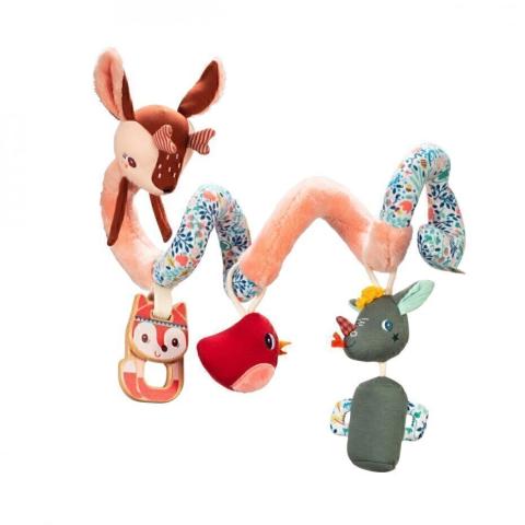 Verrassende geluiden en texturen, contrasterende kleuren…, deze spiraal biedt een waaier aan activiteiten, bedacht om de zintuigen van baby te stimuleren tijdens een wandeling of autorit